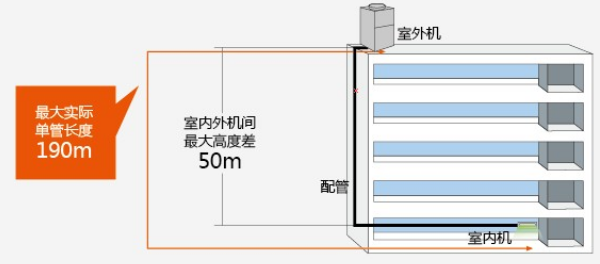 日立新風(fēng)機最大單管長度增加到190米,室內(nèi)機與室外機的高度差可達50米,方便安裝。