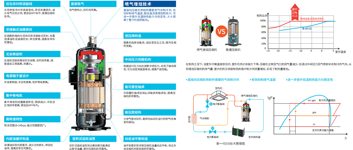 內(nèi)核驅(qū)動(dòng)控制、高性能直流變頻噴氣增焓渦旋式壓縮機(jī)、壓縮機(jī)智控技術(shù)、可靠系統(tǒng)結(jié)構(gòu)設(shè)計(jì)