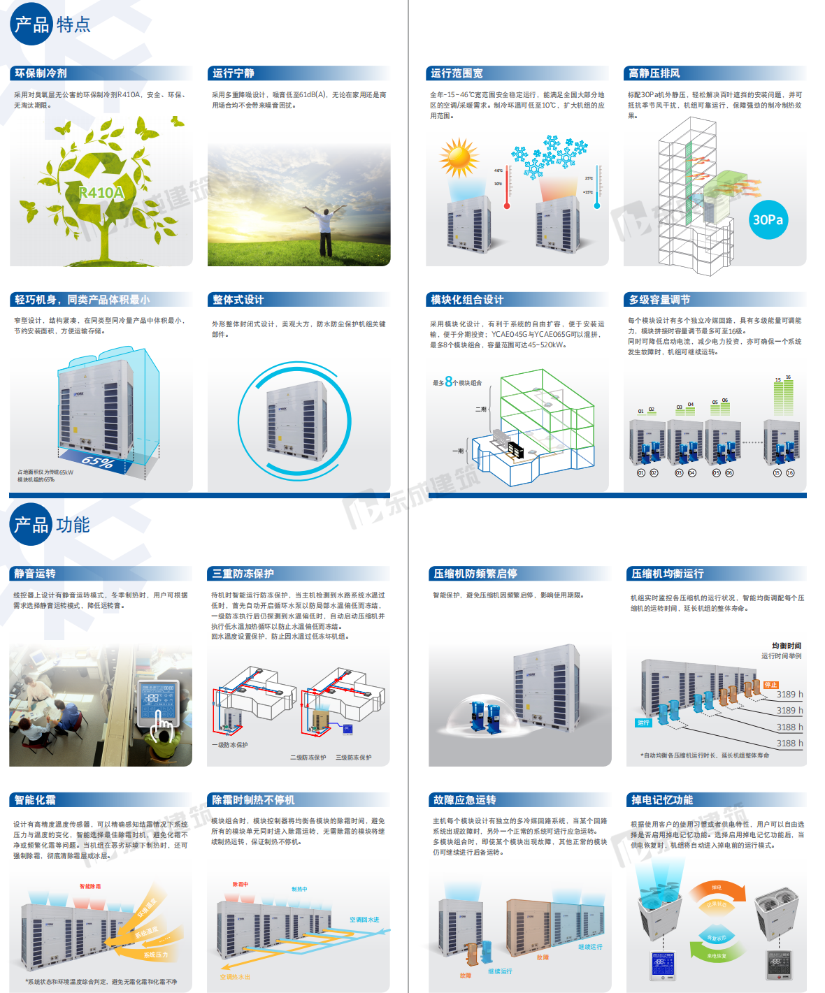 YCAE-G最多可允許拼接8個(gè)模塊,冷量范圍從65~1040kW。機(jī)組可放置于室外屋頂或者地面,配合末端和空氣處理設(shè)備可作為餐廳、酒吧、酒店、辦公樓、高檔會所等各種商用場合的空調(diào)系統(tǒng)。機(jī)組具有容量范圍廣,拼接安裝簡單,環(huán)保冷媒、運(yùn)轉(zhuǎn)寧靜等特點(diǎn)。