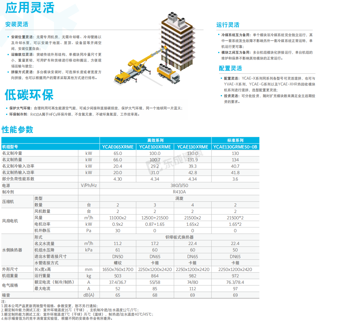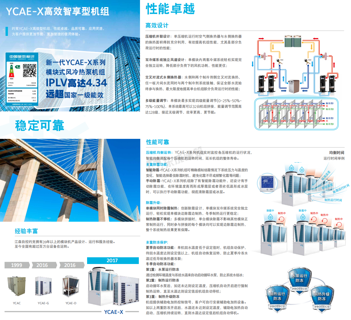 約克模塊式風(fēng)冷冷水/熱泵機組傳承YORK®多年模塊機設(shè)計、制造、運行和服務(wù)經(jīng)驗,致力于打造約克YCAE-X高效型機組,性能卓越、穩(wěn)定可靠、智能控制、應(yīng)用靈活和低碳環(huán)保的機組, 為客戶提供更高效節(jié)能。X-Power系列以其超高效的性能引領(lǐng)模塊式風(fēng)冷冷水/熱泵機組市場。 |